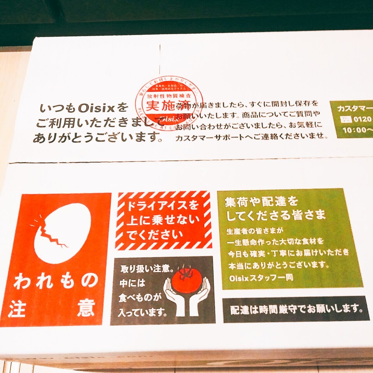 オイシックス専用の箱には、配達してくれる配送業者さん達へのお願いがビッシリと記載されていました!